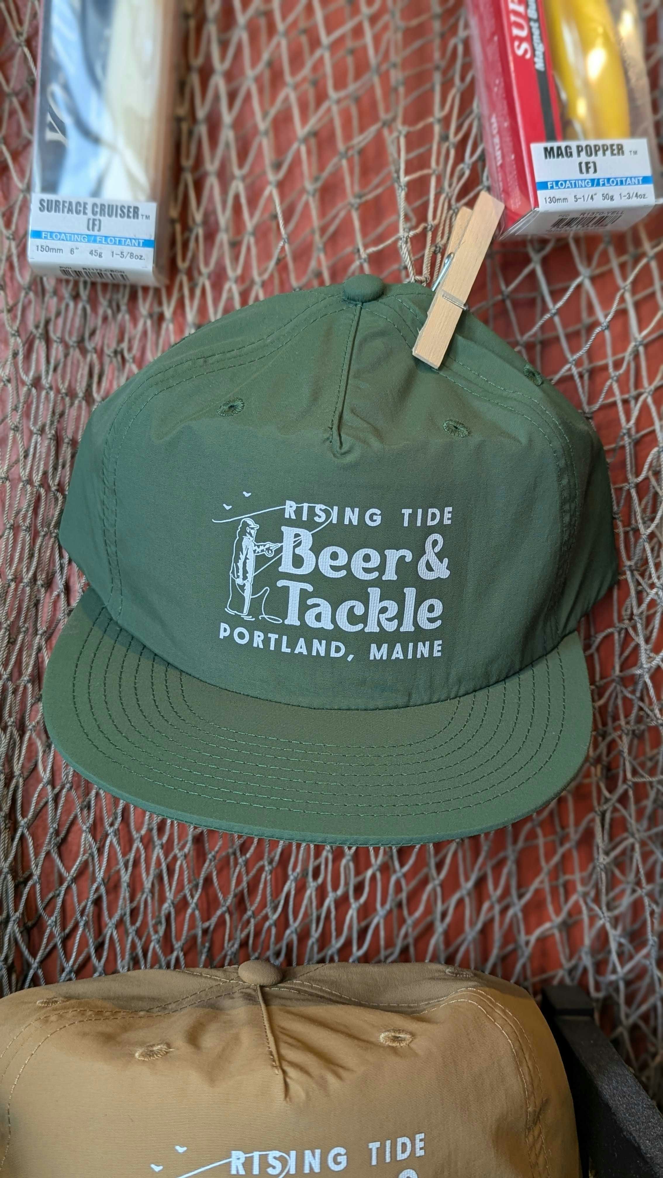 Lightweight 5 Panel “Surfer Hat” in Green with the “Rising Tide Beer + Tackle” Logo in white. One size fits most!