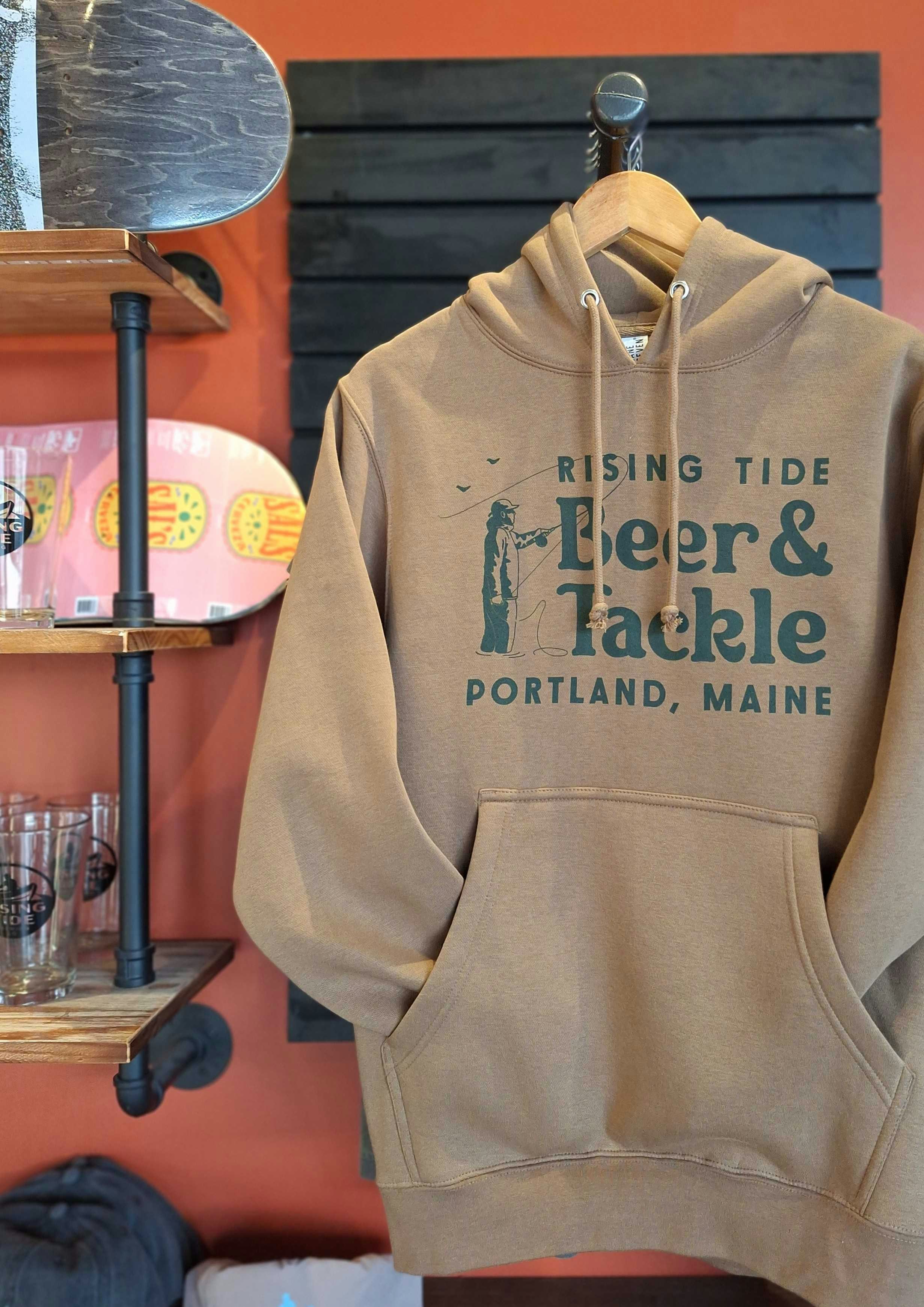 Light Brown hoodie w/ a green Rising Tide Beer & Tackle logo on the front
