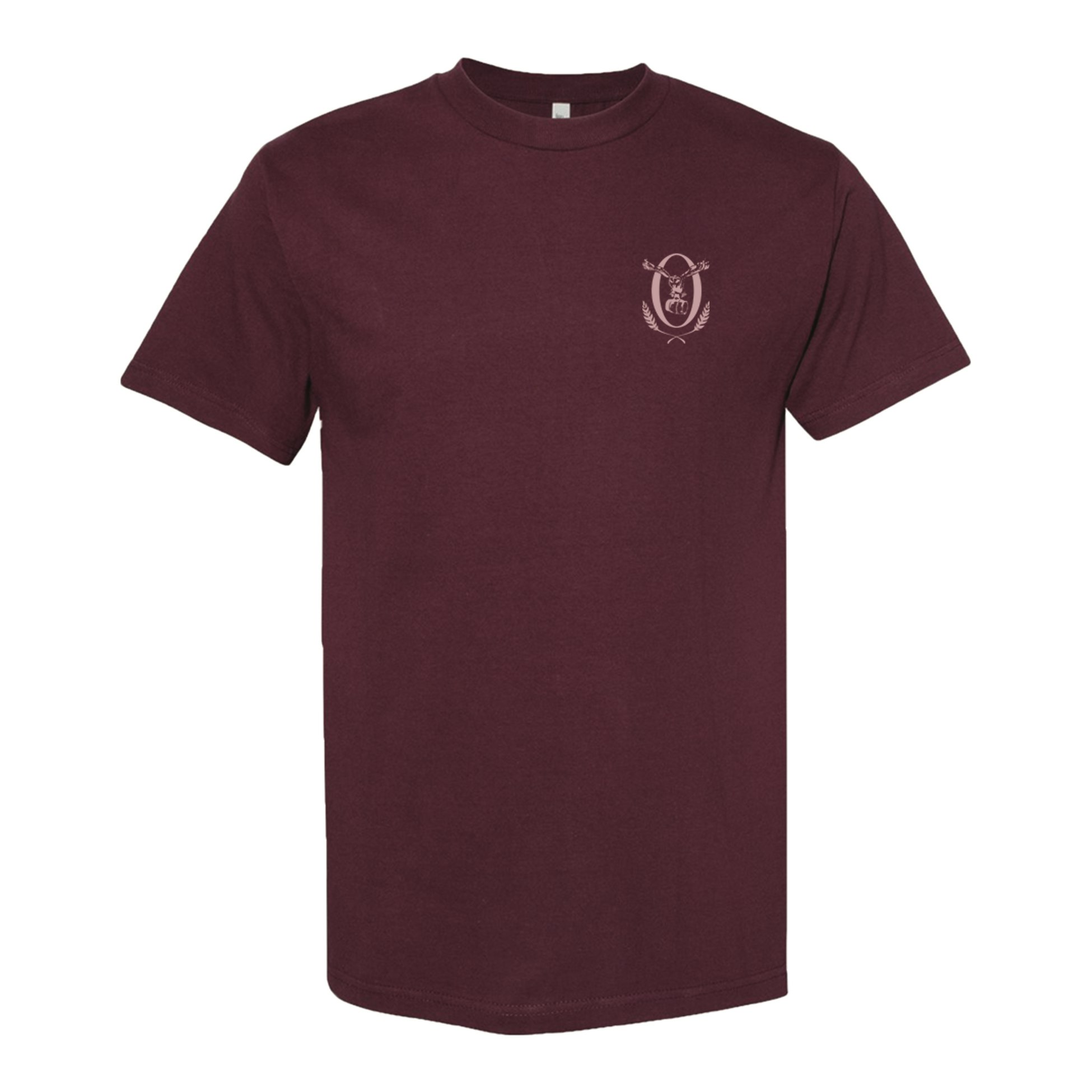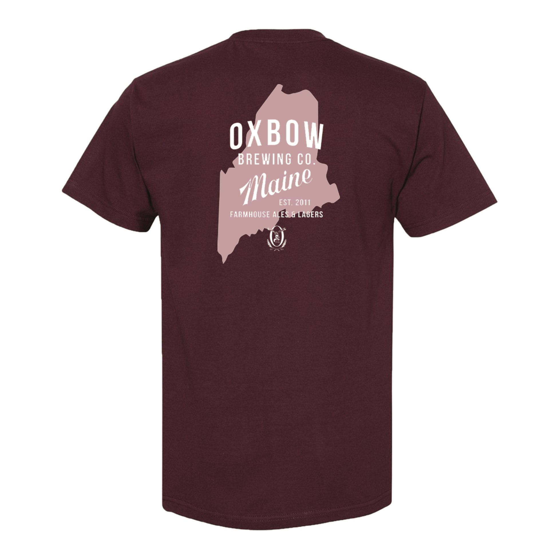 Burgundy American Apparel heavyweight tee with a relaxed fit. Features the Oxbow owl on the front left chest and bold back print with large Maine logo.