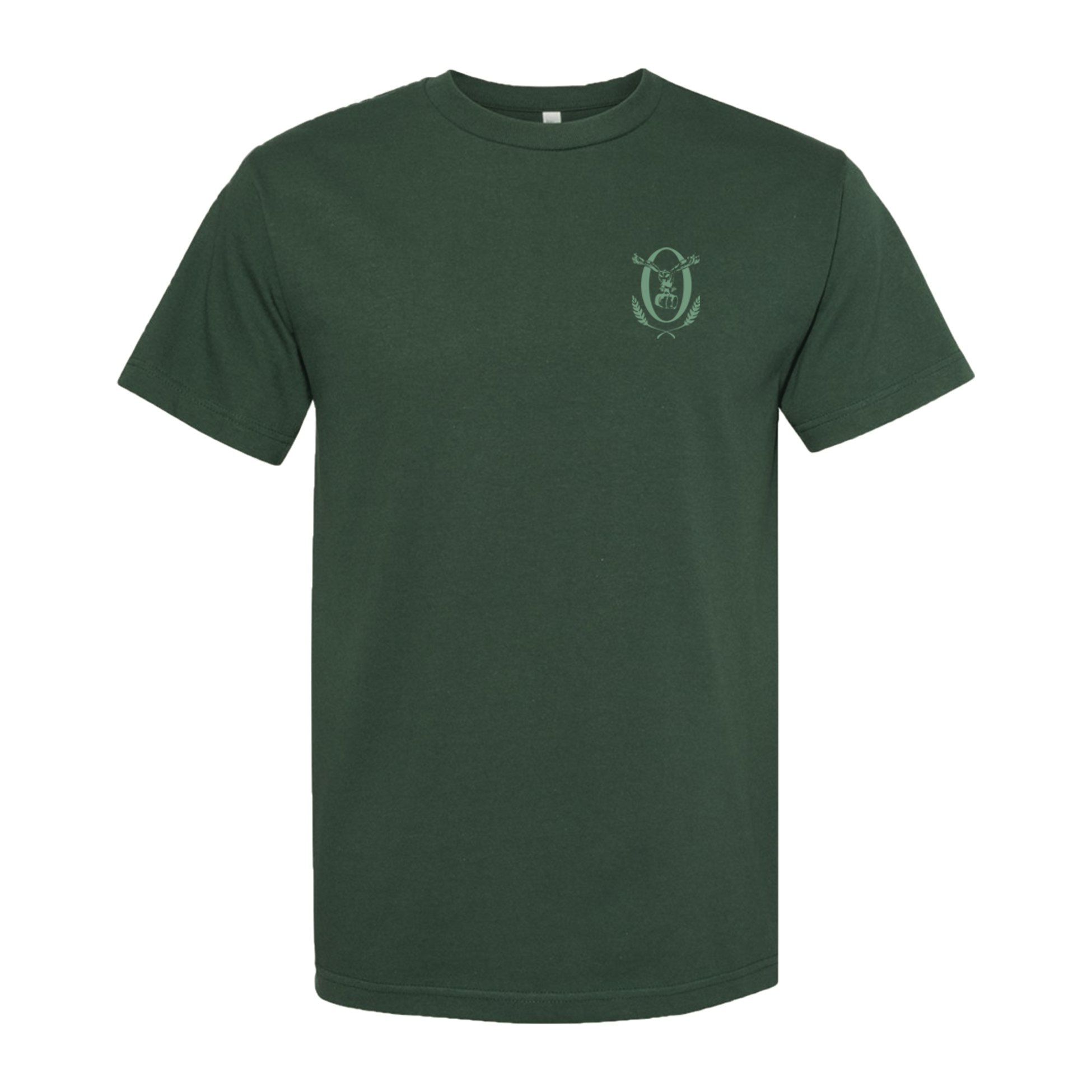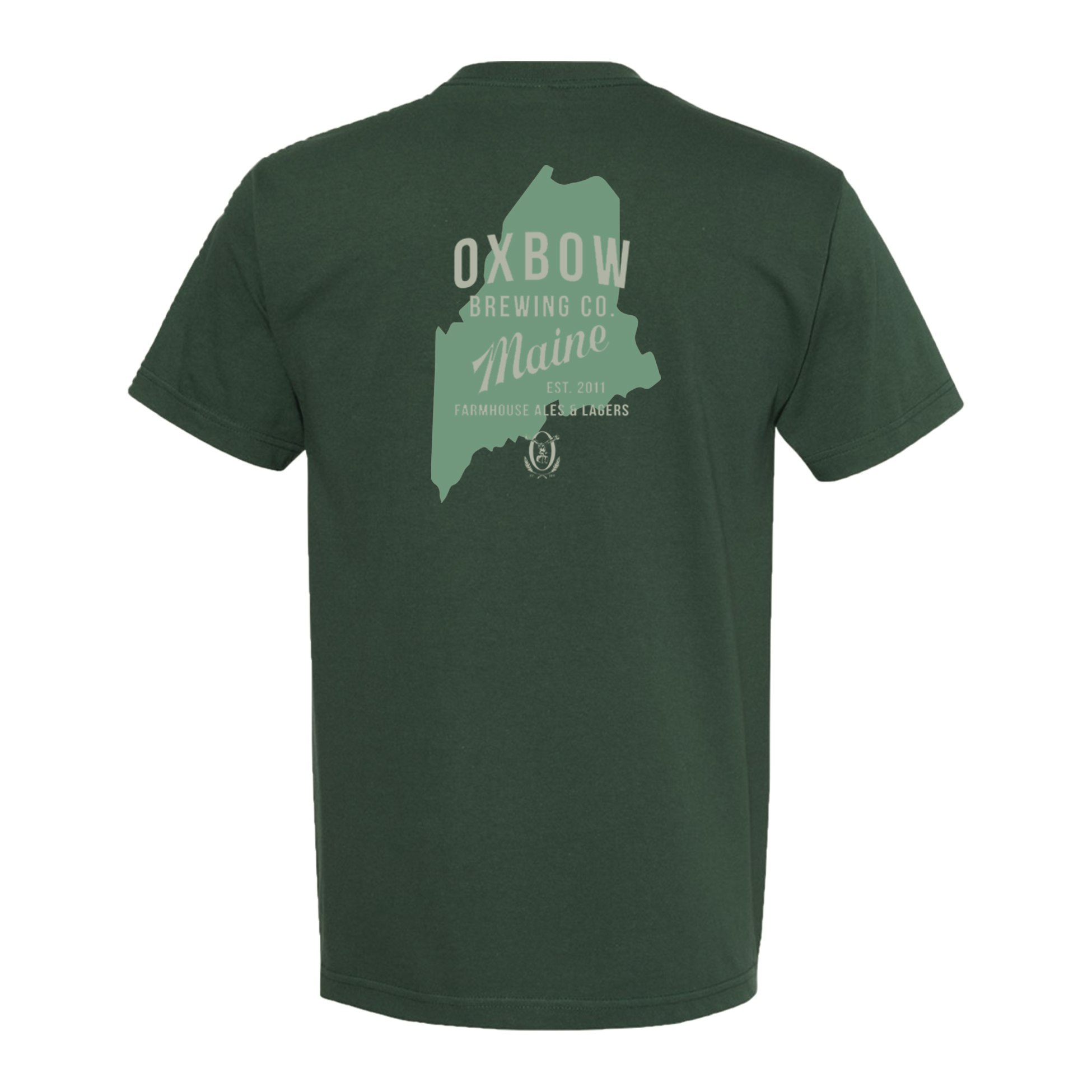 Forest American Apparel heavyweight tee with a relaxed fit. Features the Oxbow owl on the front left chest and bold back print with large Maine logo.