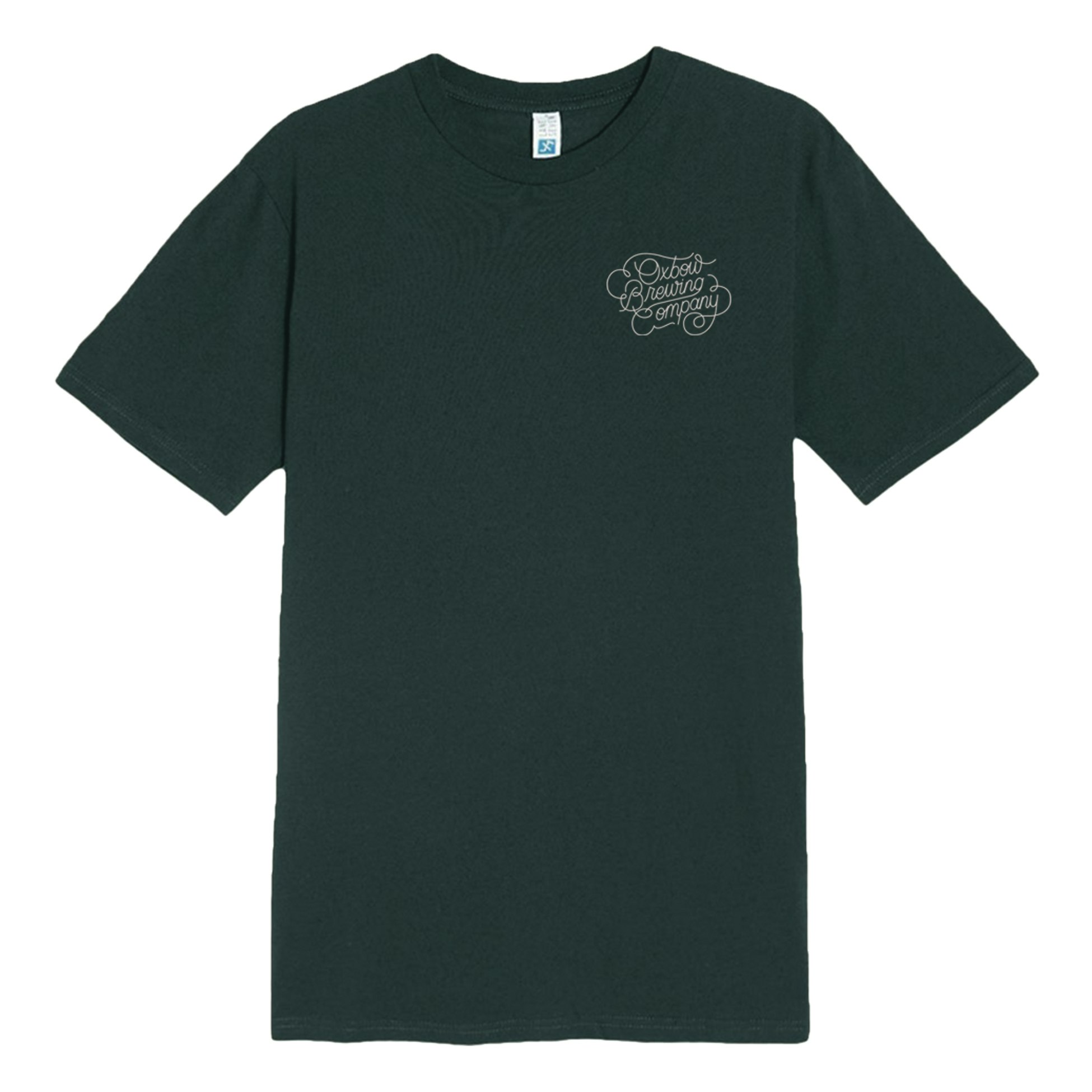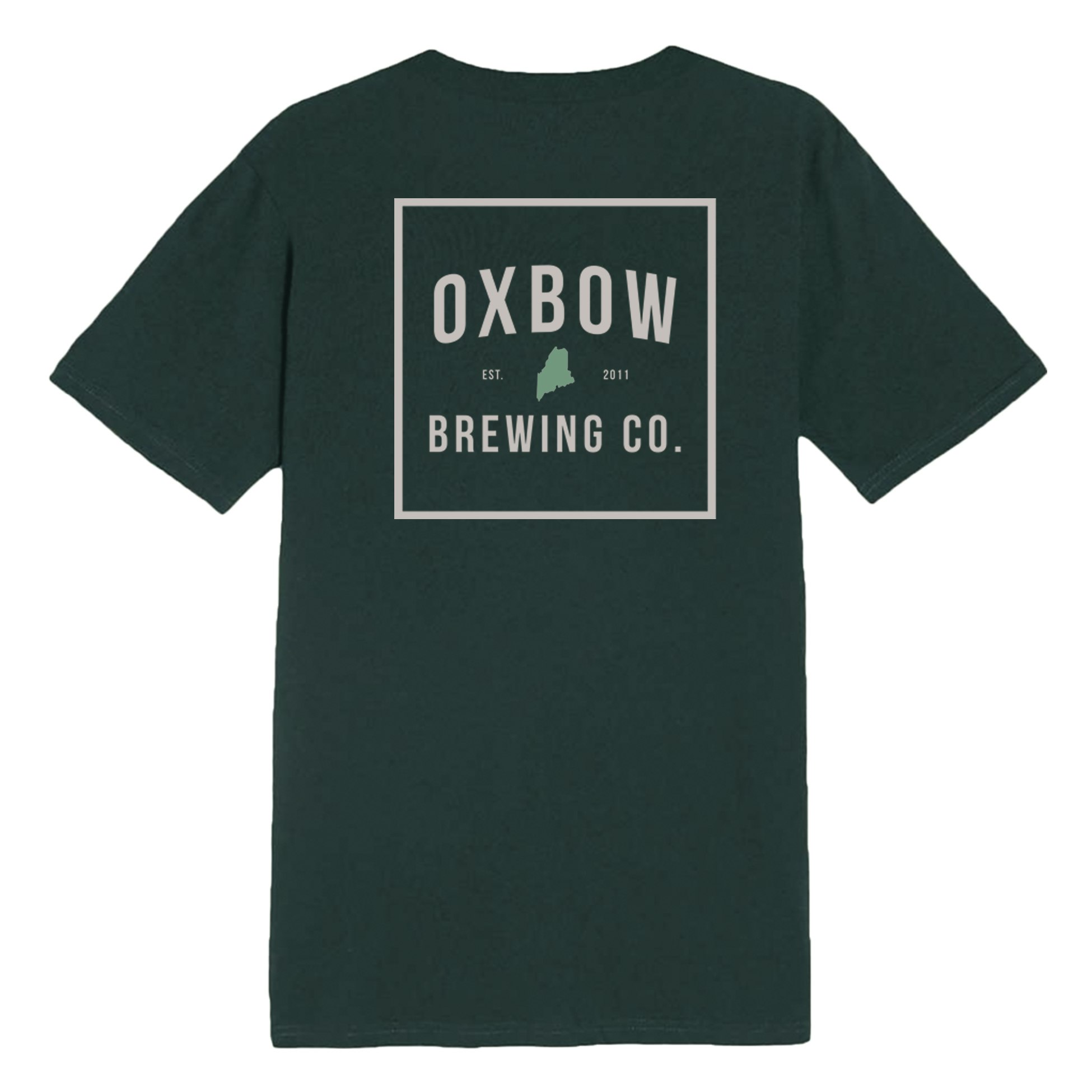 Green Lane Seven heavyweight tee with a relaxed fit. Features the Oxbow script logo on the front left chest and bold back print with “OXBOW BREWING CO.” and a light green Maine silhouette.