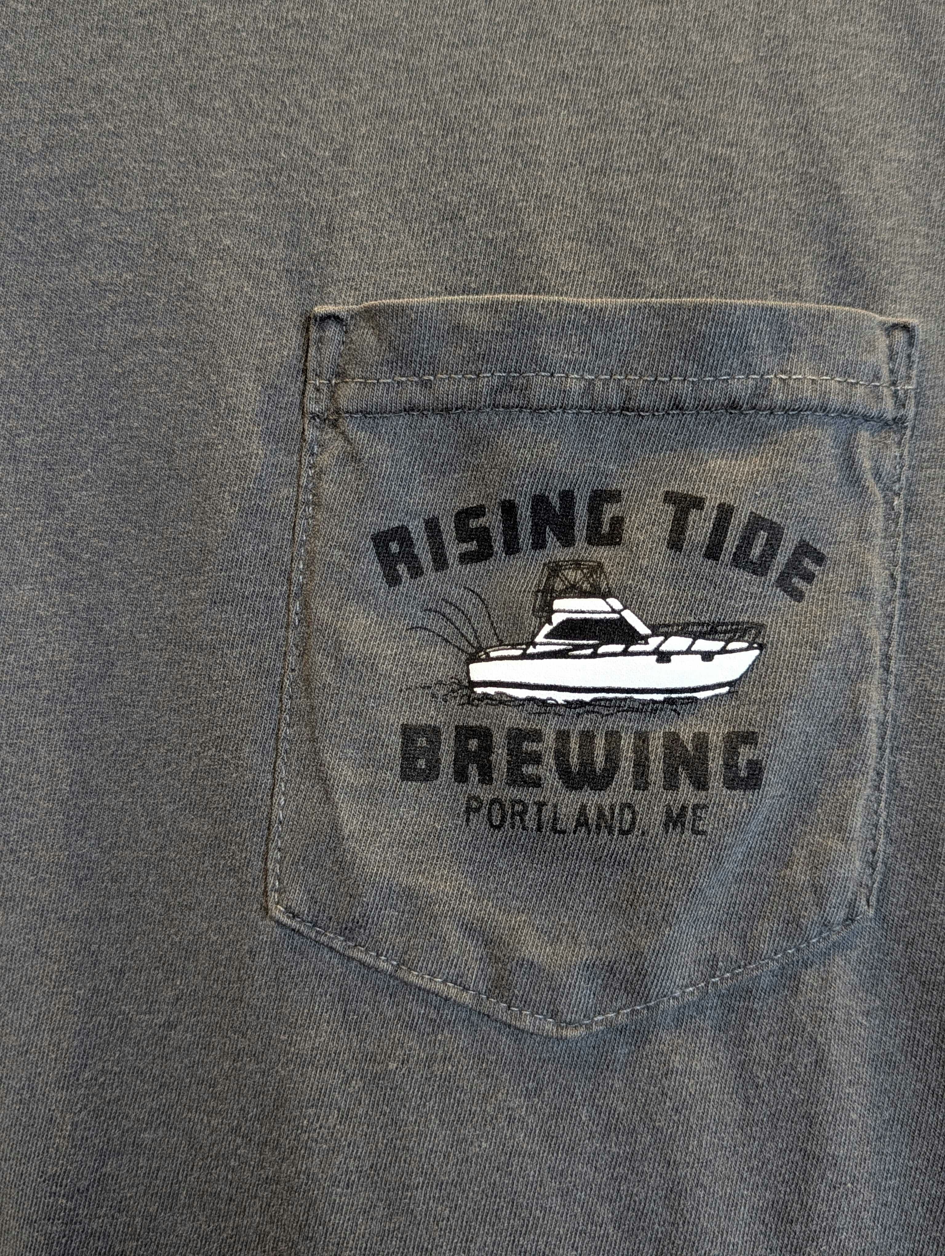 Unisex sized Gray Comfort Colors Pocket T-Shirt featuring a variety of Maine sea creatures on the back and a fishing boat with “Rising Tide, Portland Maine” on the pocket. Illustrated by artist Eric Hinkley! Screen Printed by The Arm Factory (Portland, ME)