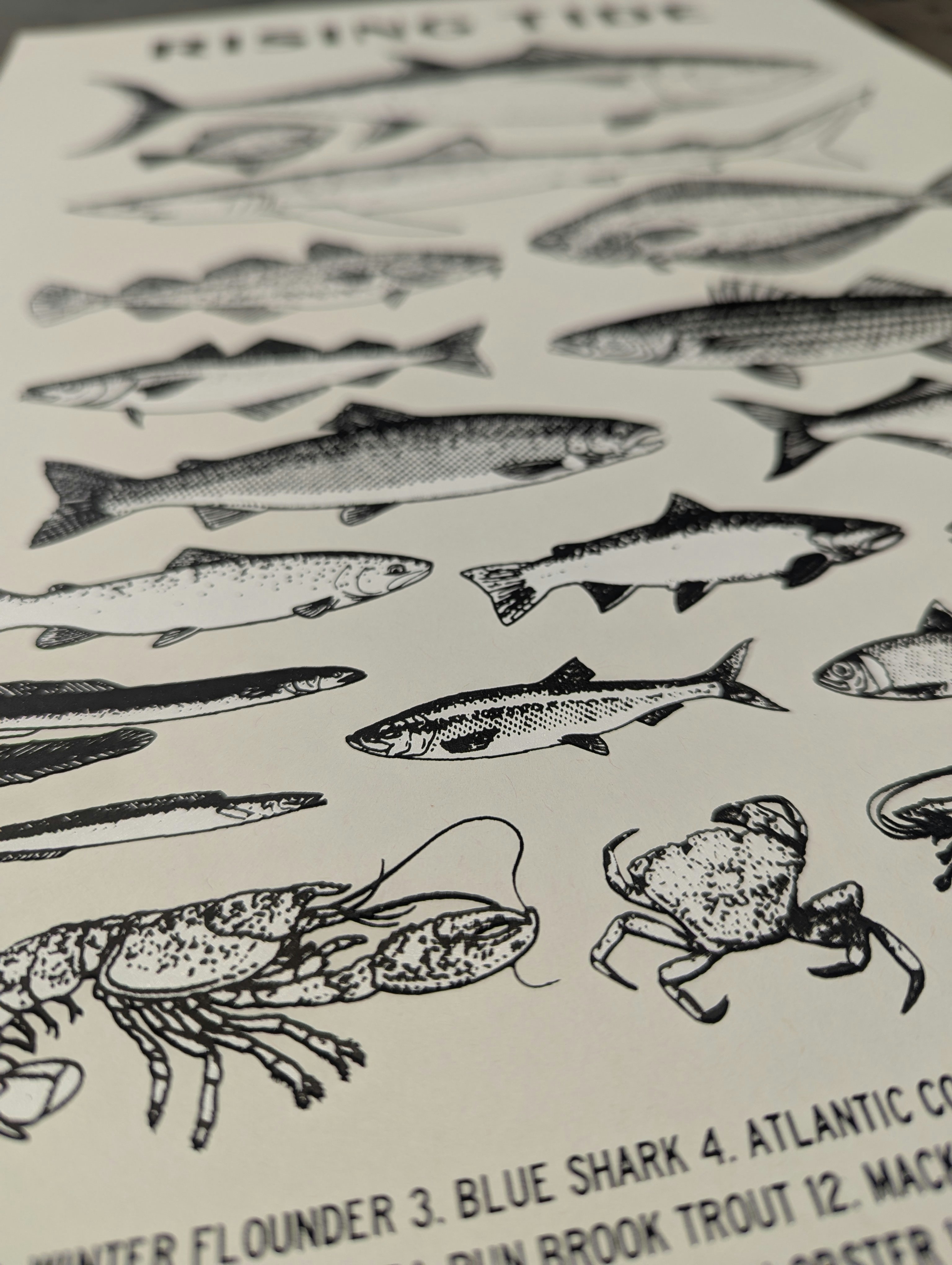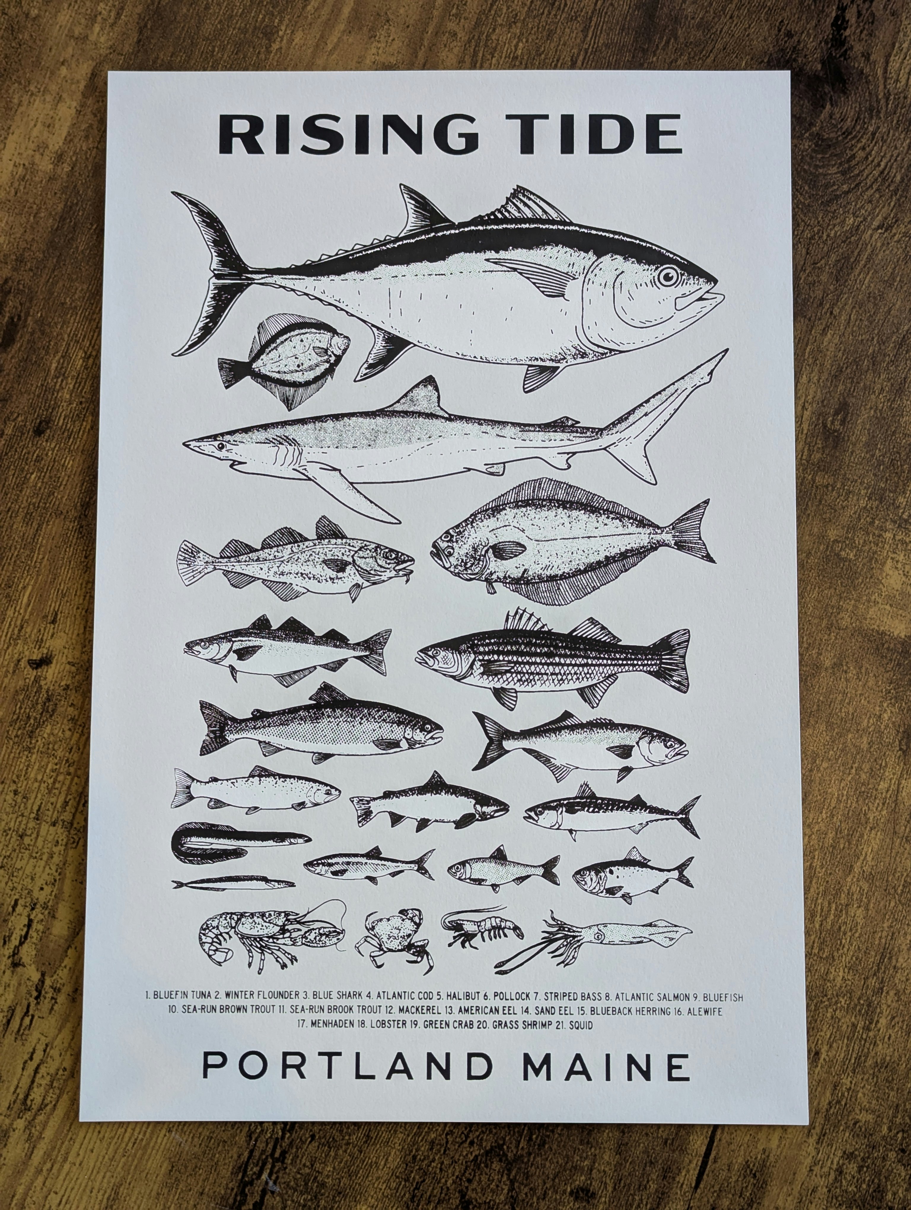 12″ x 18″ Poster featuring a variety of Maine sea creatures illustrated by Eric Hinkley! Hand-pulled Screen Print by The Arm Factory (Portland, ME) on heavy duty French Paper.