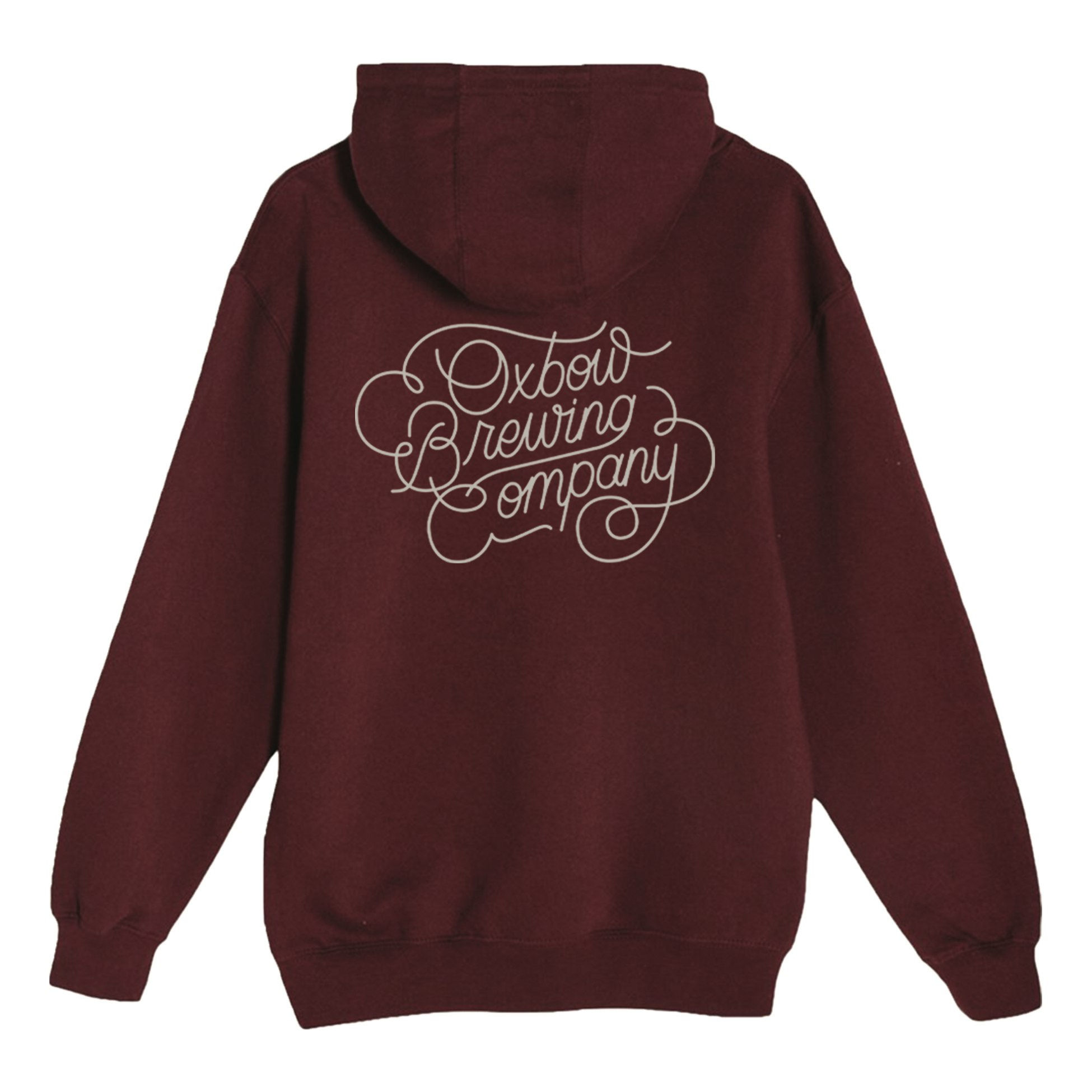 Maroon hoodie w/ Oxbow Owl Logo on front and Oxbow Script Logo on back