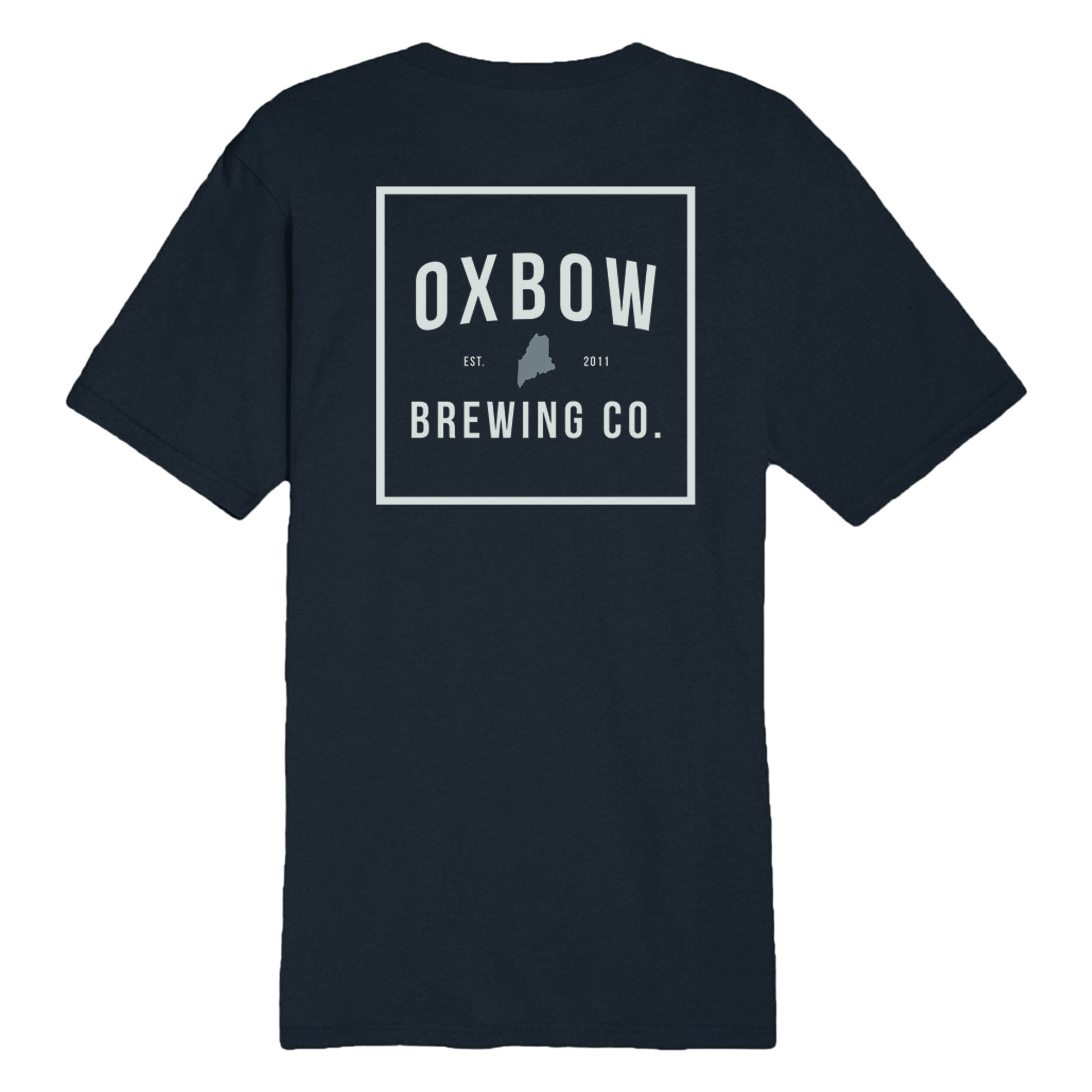 Navy Lane Seven heavyweight tee with a relaxed fit. Features the Oxbow script logo on the front left chest and bold back print with “OXBOW BREWING CO.” and a light blue Maine silhouette.